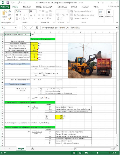 Para nuestros seguidores les presento una hoja Excel para el Cálculo del Rendimiento de una Volqueta, con la siguiente plantilla se podrá saber cuántos m3 cargará en una hora, cuantas paladas se necesitan para llenarlo, y cuantos volquetes son necesarios para cargar una cierta cantidad de m3.